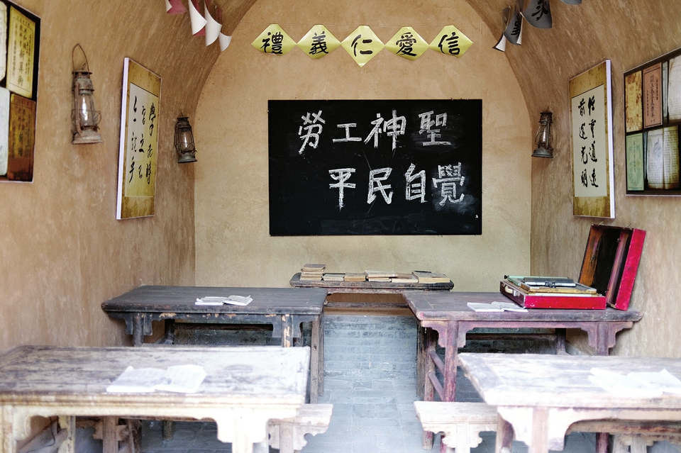 推開(kāi)堆云洞一層側(cè)院展廳木門(mén),明媚的陽(yáng)光照進(jìn)教室,黑板上“勞工神圣平民自覺(jué)”8個(gè)粉筆字赫然在目,老舊的桌椅、殘留的坑道、銹跡斑斑的馬燈,雖已被時(shí)間抹去了原有的模樣,但仍時(shí)刻警醒著后人勿忘國(guó)恥。