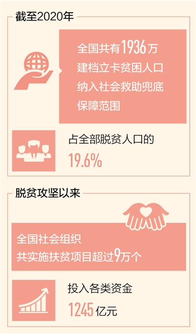 習(xí)近平總書記指出,民政工作關(guān)系民生、連著民心,是社會建設(shè)的兜底性、基礎(chǔ)性工作。決戰(zhàn)決勝脫貧攻堅,民政部門以完善制度機制、聚焦特殊群體、助力重點地區(qū)攻堅等政策“組合拳”,兜住最困難群體,保住最基本生活。數(shù)據(jù)顯示,截至2020年,全國共有1936萬建檔立卡貧困人口納入社會救助兜底保障范圍,占全部脫貧人口的19.6%,脫貧地區(qū)群眾獲得感、幸福感、安全感不斷提升。