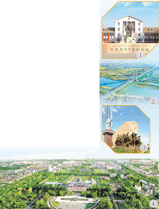 石河子市被譽為“共和國軍墾第一城”。第一代老軍墾陸振歐回憶當時的情景,仍記憶猶新:“那時只有車馬店、賣馕的幾戶人家,除了北面蘆葦?shù)?,到處是荒灘戈壁?!钡谝淮鴪F人喝鹽堿水、睡“地窩子”,人拉肩扛、挖渠引水、改造葦湖、開墾荒地,在荒無人煙的大漠之邊打造了一座現(xiàn)代化新城。如今,石河子市碧水繞城、綠意盎然、鳥語花香,綠蔭掩映座座現(xiàn)代化廠房。石河子崛起為新疆重要工業(yè)基地,享有“戈壁明珠”的美名?!笆幼訌囊粡埌准埰鸺?,發(fā)展到現(xiàn)在,靠的就是兵團人艱苦奮斗、開拓創(chuàng)新的精神?!标懻駳W感慨地說。