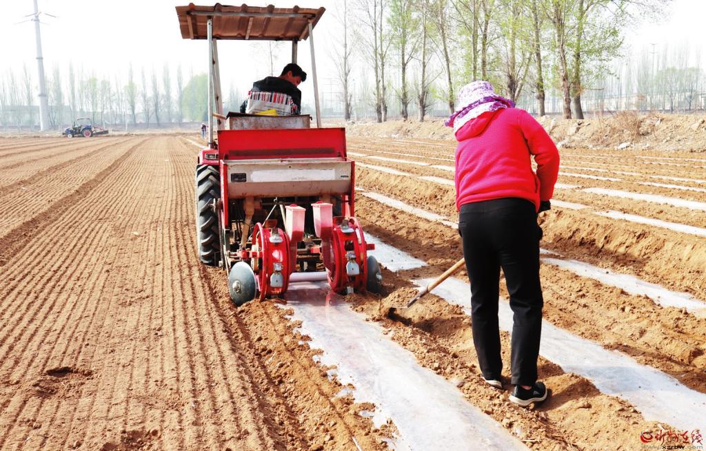 近年來,忻府區(qū)小奇村大力發(fā)展甜糯玉米產(chǎn)業(yè),每年種植面積達(dá)到千畝以上,為全村農(nóng)民增收、農(nóng)業(yè)增效發(fā)揮了積極作用。圖為農(nóng)戶在小奇村千畝甜糯玉米種植園區(qū)播種鋪膜。(記者 張林泉攝)