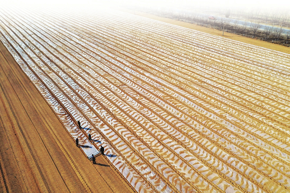 3月24日,在運城市北部峨嵋?guī)X上聞喜縣畖底鎮(zhèn)西畖底村,村民抓緊為中藥材防風(fēng)覆蓋地膜保墑保苗(無人機照片)。連日來,運城市農(nóng)民搶抓農(nóng)時科學(xué)種植中藥材,為新種植的防風(fēng)等中藥材精心覆蓋地膜,節(jié)能保墑保苗保質(zhì)量,助力增產(chǎn)增收。從空中俯瞰,田間覆蓋的地膜與農(nóng)民勞作的身影相映成趣,宛如一幅精美的現(xiàn)代農(nóng)耕畫卷。高新生攝 (責(zé)任編輯:盧相?。?/span> |