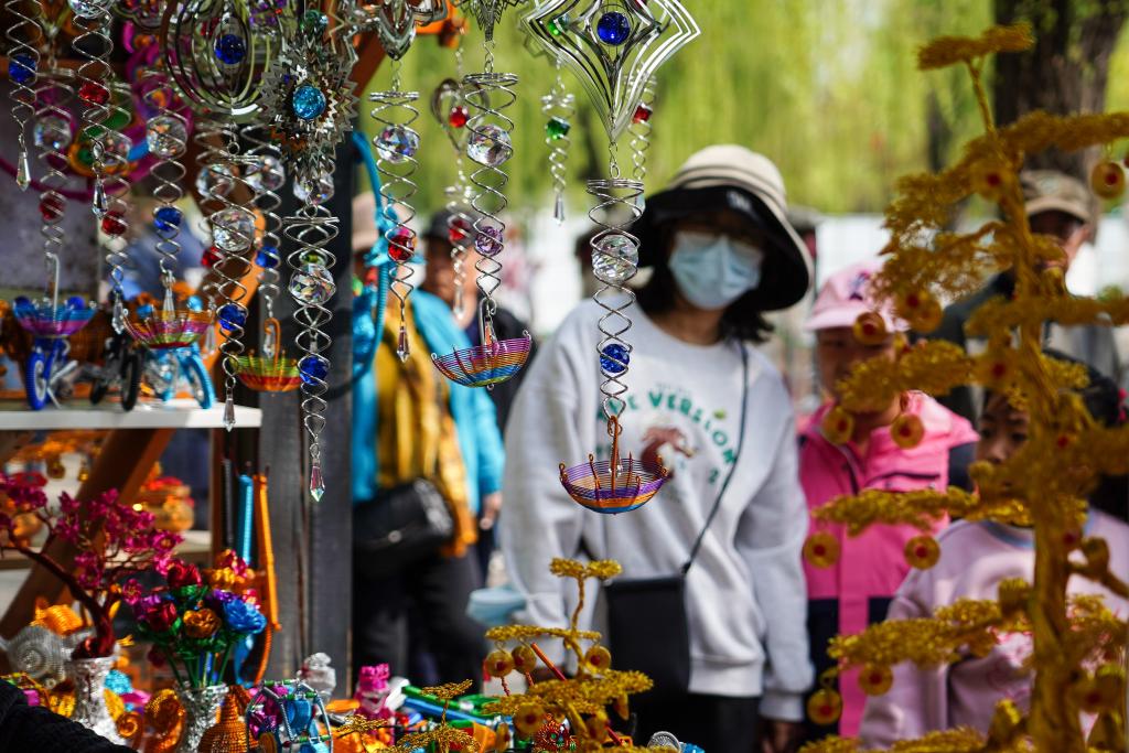 2024年4月5日,游客在濟南曲水亭街參觀傳統(tǒng)手工藝品。新華社記者 朱崢 攝