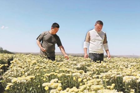 有了方向,行動是關鍵。黨員徐大衛(wèi)主動請纓,第一時間不遠千里趕赴菊花主產區(qū)射陽考察菊花種植項目,經過充分分析研判,篩選適宜五寨種植的品種,最終選定北京菊試種。同時,他帶著誠意誠心,從射陽請來3名技術專家。在晉西北中藥材產業(yè)孵化園附近,他與3位專家同吃同住,深入田間地頭,與群眾同勞作、共生活。依據(jù)菊花種植要求,手把手教會群眾平整土地、開挖溝槽、栽種澆水、鋤草施肥和采挖收儲等中藥材精耕細作技術。針對菊花農殘、重金屬超標的問題,在試種過程中,他精心研究、反復摸索,大膽探索出了一套適用于菊花的種植技術,實現(xiàn)了菊花農殘可控的突破,先試種的100畝菊花,獲得了成功。