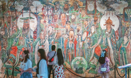 永樂宮“壁彩重華”展廳內(nèi),在3D打印、數(shù)字壁畫、AR識(shí)別等數(shù)字技術(shù)加持下,700多年前的壁上丹青,完美再現(xiàn)絕世容顏。