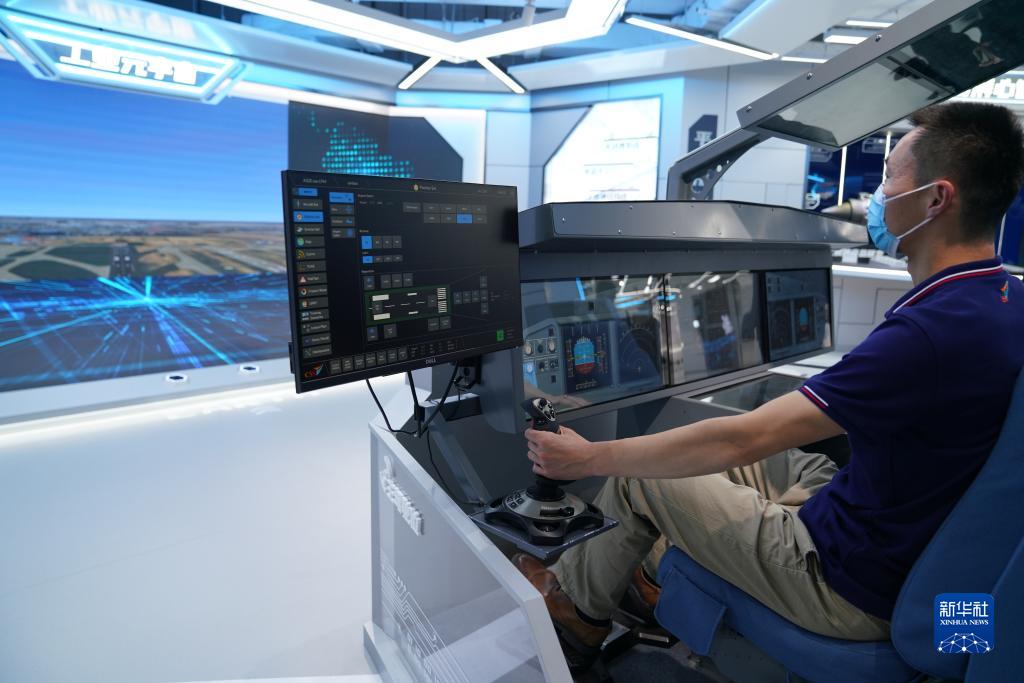 5月11日,在上海城市數(shù)字化轉(zhuǎn)型體驗(yàn)館,工作人員操作一款數(shù)字化飛行仿真訓(xùn)練平臺。新華社記者 馬寧 攝