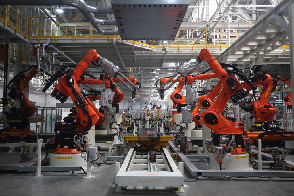黃色的機(jī)械臂上下?lián)]舞,無人搬運車穿梭不停,焊裝線火花四濺,配備了高精度傳感器和先進(jìn)機(jī)器視覺系統(tǒng)的焊接機(jī)器人正在精準(zhǔn)焊接車身部件……