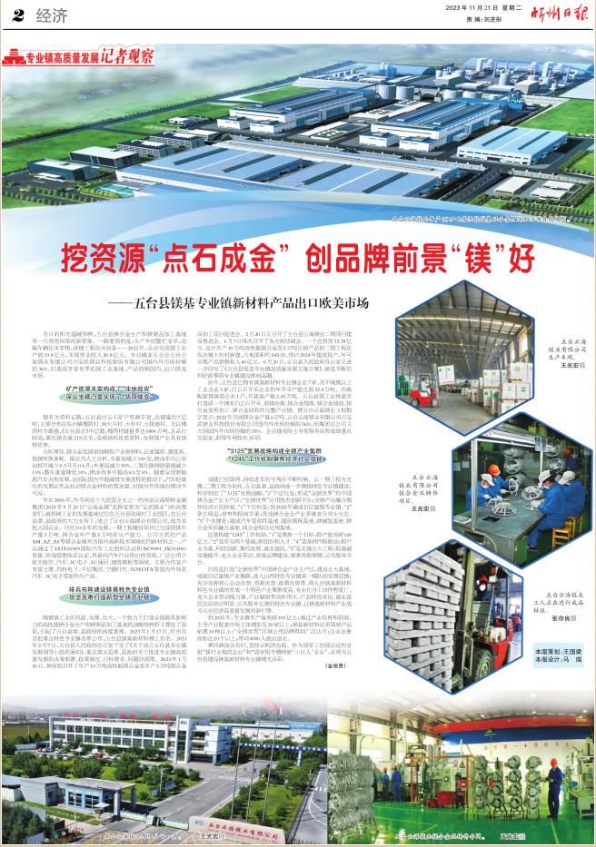 早在2006年,作為南京十大民營企業(yè)之一的南京云海特種金屬集團(2023年9月20日“云海金屬”名稱變更為“寶武鎂業(yè)”)的決策者就將鎂工業(yè)的發(fā)展基地定位在五臺縣溝南鄉(xiāng)工業(yè)園區(qū),在五臺縣委、縣政府的大力支持下,成立了五臺云海鎂業(yè)有限公司,成為首批入園企業(yè)。10余年的發(fā)展,一期工程建設項目已完成原鎂年產量3萬噸、鎂合金年產量5萬噸生產能力的目標任務。該公司主營的產品AM、AZ、AS等鎂合金被列為國內高新技術領域的四新材料之一,產品通過了IATF16949國際汽車工業(yè)組織認證和ISO9001、ISO14001質量、環(huán)境管理體系認證,具備向汽車行業(yè)供應的資質,產品廣泛應用于航天航空、汽車、3C電子、5G通訊、建筑模板等領域。該公司主要合作客戶有富士康、均勝電子、中信集團、寧德時代、TOYOTA等國內外知名汽車、3C電子零部件生產商。2022年,完成鎂合金產量6萬噸的專業(yè)鎮(zhèn)龍頭企業(yè)五臺云海鎂業(yè)有限公司占寶武鎂業(yè)科技股份有限公司國內外市場份額的36%,而集團總公司又占到國內外市場份額的35%。企業(yè)建有院士專家服務站和省級重點實驗室,取得專利技術35項。