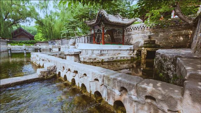 這首詩描寫的景致主要是“晉祠之水”。從詩中,我們可以發(fā)現(xiàn)晉祠之水有兩個(gè)特點(diǎn)。一是綠,因?yàn)樗袖仢M莎草,所以“晉祠之水如碧玉”。這景象如今前往晉祠還能看得見。二是水量充沛,能讓人“浮舟弄水”,而船上除了李白、元演,還有許多樂工歌伎,免不了還會(huì)有其他賓客,合理猜測,船定然不是一葉扁舟,起碼是游船不可。李白寫詩好夸張,形容晉祠之水為“百尺清潭”。然而他也說過“桃花潭水深千尺”,廬山瀑布“飛流直下三千尺”,說晉祠之水僅僅“百尺”,在李白詩中尚算保守。