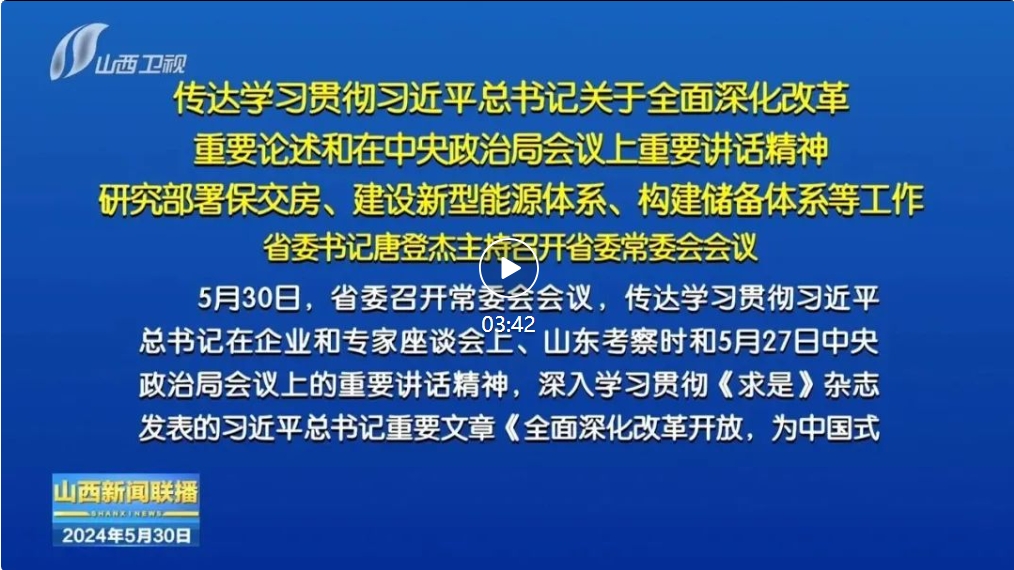 山西日報報道 5月30日,省委召開常委會會議,傳達(dá)學(xué)習(xí)貫徹習(xí)近平總書記在企業(yè)和專家座談會上、山東考察時和5月27日中央政治局會議上的重要講話精神,深入學(xué)習(xí)貫徹《求是》雜志發(fā)表的習(xí)近平總書記重要文章《全面深化改革開放,為中國式現(xiàn)代化持續(xù)注入強(qiáng)勁動力》,傳達(dá)貫徹全國切實做好保交房工作視頻會議精神,審議通過《山西省加快規(guī)劃建設(shè)新型能源體系的實施意見》《關(guān)于構(gòu)建山西省儲備體系的行動方案》。省委書記唐登杰主持會議。