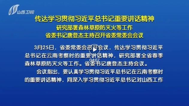 山西日報報道 3月25日,省委常委會召開會議,傳達學(xué)習(xí)貫徹習(xí)近平總書記在云南考察時的重要講話精神,研究部署全省春季森林草原防滅火等工作。省委書記唐登杰主持會議。