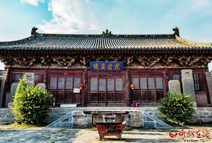 該寺建于高7米的土臺(tái)之上,四周筑高堡圍墻,“踞高而臨深”。寺內(nèi)現(xiàn)存建筑除大殿外,還有東配殿5間,西配房5間,庫房3間。正殿懸匾“毗廬真境”。面闊5間,七檁六椽,懸山頂花琉璃獸脊。斗拱六鋪?zhàn)鲉纬p下昂,補(bǔ)間斗拱斜拱一朵。