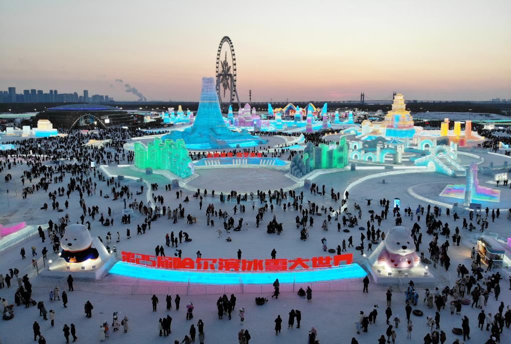 2月15日,游客在哈爾濱冰雪大世界園區(qū)內(nèi)游玩(無(wú)人機(jī)照片)。新華社記者 王建威 攝