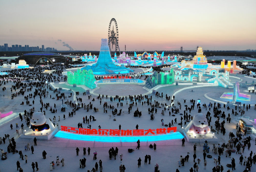 2024年2月15日,游客在哈爾濱冰雪大世界園區(qū)內(nèi)游玩(無人機照片)。新華社記者 王建威 攝