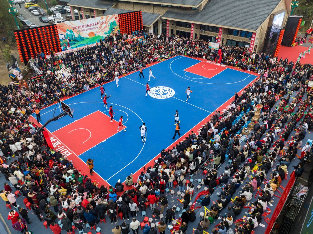 2024年1月29日,村民、游客在現(xiàn)場觀賽(無人機照片)。當(dāng)日,在四川省宜賓市珙縣巡場鎮(zhèn)三合村,2024宜賓首屆和美鄉(xiāng)村文化節(jié)暨首屆和美鄉(xiāng)村籃球決賽(村BA)舉行,同時,現(xiàn)場還舉行了非遺年貨購物節(jié)、消費券發(fā)放等活動,以賽事經(jīng)濟(jì)激發(fā)鄉(xiāng)村活力。新華社發(fā)(莊歌爾攝)