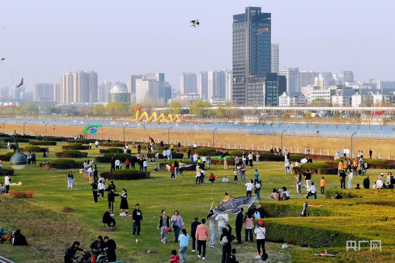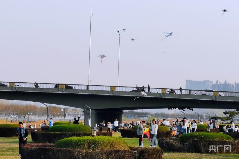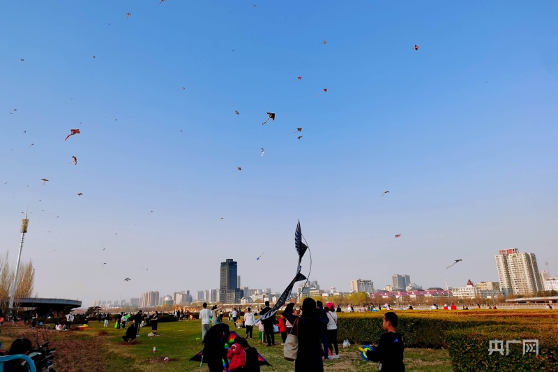市民聚集在綠意盎然的汾河岸畔放風箏(央廣網(wǎng)記者 郎麒 攝)