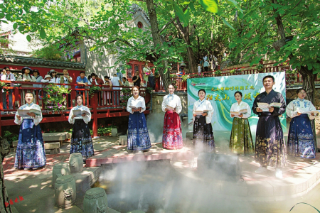 在太山景區(qū)售票廳里,背誦古詩詞免門票的活動吸引了不少18周歲以下的學(xué)生參加,大家通過轉(zhuǎn)盤選定需要背誦的古詩詞,完成背誦即可獲得門票一張?!昂屯瑢W(xué)們正好一塊兒來了,通過參加這個(gè)活動,弘揚(yáng)我們的傳統(tǒng)文化,是非常有意義的?!苯衲晔钇冢骄皡^(qū)面向廣大學(xué)生推出皮影戲、手工DIY印章、拓印等非遺體驗(yàn)活動。同時(shí),景區(qū)還準(zhǔn)備了2000多套漢服,免費(fèi)為游客提供。