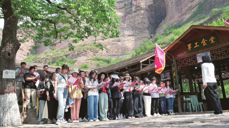 在壯麗的崖壁背景下,嘹亮的歌聲響起,《三大紀律八項注意》《勤儉是咱們的傳家寶》……一首首經(jīng)典旋律,將嚴明的紀律要求與樸素的廉潔觀念,通過激昂的音符直抵人心。歌聲在山谷間激蕩,廉潔的種子在集體共鳴中悄然播撒。