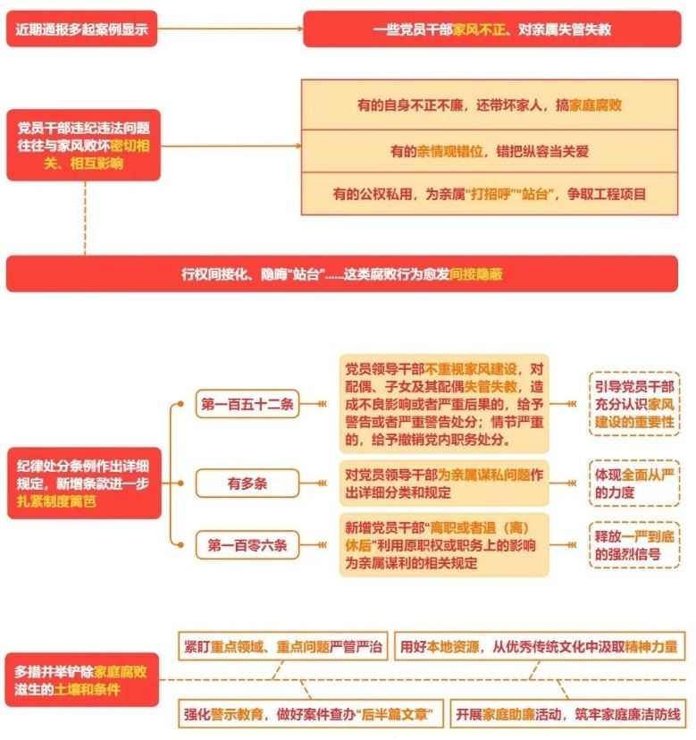 新修訂的《中國共產黨紀律處分條例》第一百五十二條對黨員領導干部“不重視家風建設,對配偶、子女及其配偶失管失教,造成不良影響或者嚴重后果”的情況作出規(guī)定,引導黨員干部充分認識家風建設的重要性。