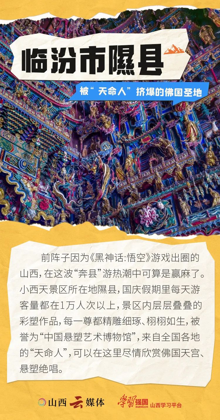 10月18日,山西黃河、長城、太行三個一號旅游公路全線貫通,覆蓋全省113個縣(市、區(qū)),把全省531處國保級建筑、779處省保級建筑、976個旅游景區(qū)景點全部連通。近日,“奔縣”游成為“城會玩”的年輕人的新選擇,這個深秋,跟著我們一起來山西,看看那些令人驚艷的寶藏小城,開啟一段發(fā)“縣”之旅。