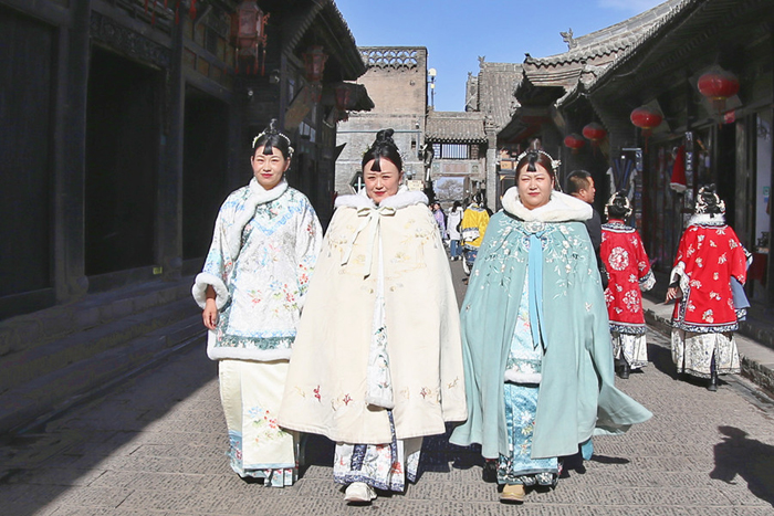 游客裝扮成晉商少奶奶,走在平遙古城里。記者錢(qián)龍攝