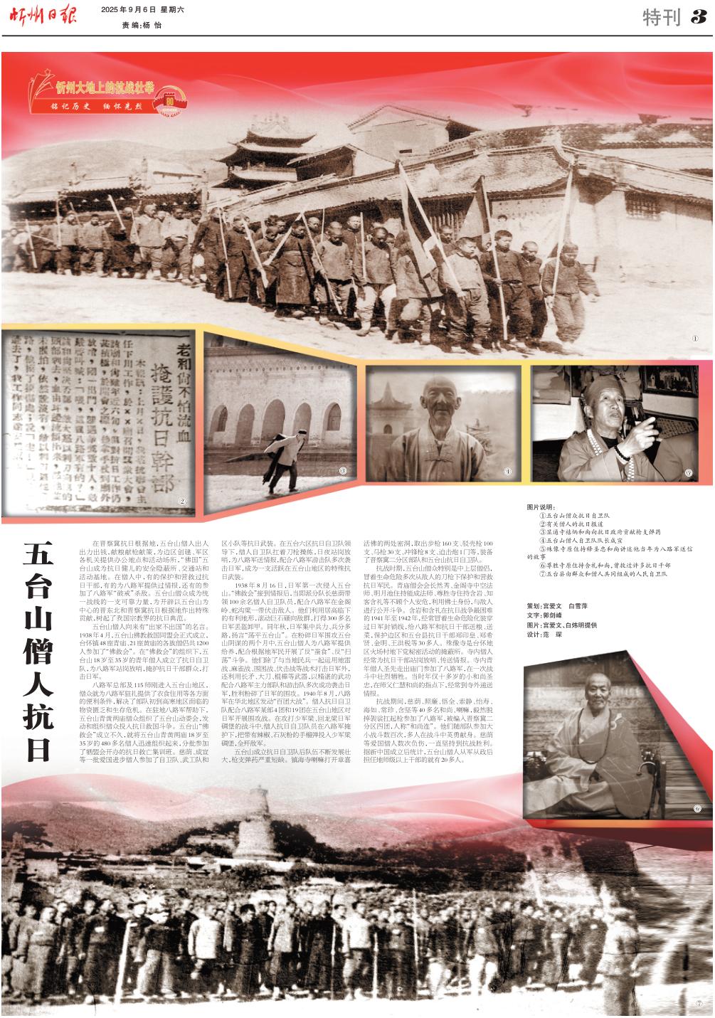 1938年8月16日,日軍第一次侵入五臺山?!胺鹁葧苯拥角閳蠛?,當即派分隊長慈蔭帶領100余名僧人自衛(wèi)隊員,配合八路軍在金閣嶺、蛇溝梁一帶伏擊敵人。他們利用居高臨下的有利地形,滾動巨石砸向敵群,打得300多名日軍丟盔卸甲。同年秋,日軍集中兵力、兵分多路,揚言“蕩平五臺山”。在粉碎日軍圍攻五臺山陰謀的兩個月中,五臺山僧人為八路軍提供給養(yǎng),配合根據(jù)地軍民開展了反“蠶食”、反“掃蕩”斗爭。他們除了與當?shù)孛癖黄疬\用地雷戰(zhàn)、麻雀戰(zhàn)、圍困戰(zhàn)、伏擊戰(zhàn)等戰(zhàn)術打擊日軍外,還利用長矛、大刀、棍棒等武器,以精湛的武功配合八路軍主力部隊和游擊隊多次成功襲擊日軍,勝利粉碎了日軍的圍攻。1940年8月,八路軍在華北地區(qū)發(fā)動“百團大戰(zhàn)”。僧人抗日自衛(wèi)隊配合八路軍某部4團和19團在五臺山地區(qū)對日軍開展圍攻戰(zhàn)。在攻打少軍梁、回龍梁日軍碉堡的戰(zhàn)斗中,僧人抗日自衛(wèi)隊員在八路軍掩護下,把帶有辣椒、石灰粉的手榴彈投入少軍梁碉堡,全殲敵軍。