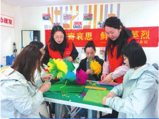 清明寄哀思,文明樹新風(fēng)。定襄縣南城社區(qū)組織工作人員與社區(qū)居民手工制作祭祀花,并免費向社區(qū)居民發(fā)放,引導(dǎo)大家摒棄燒紙陋習(xí),以環(huán)保、溫情的方式追思先人。圖為社區(qū)工作人員與居民一同制作手工祭祀花。 郭婧蕾攝